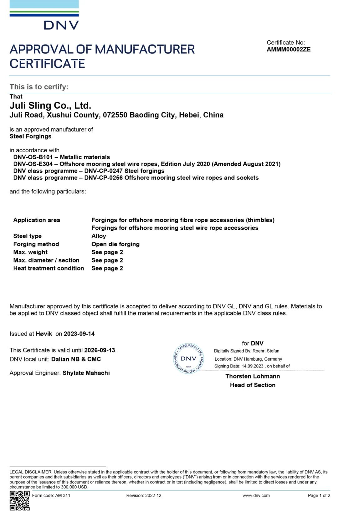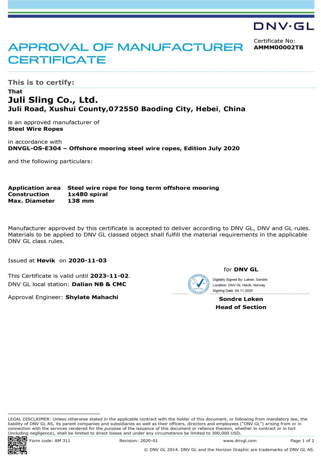(DNV長期系泊鋼絲繩接頭及纜繩套環(huán)鍛件工廠認(rèn)可證書)