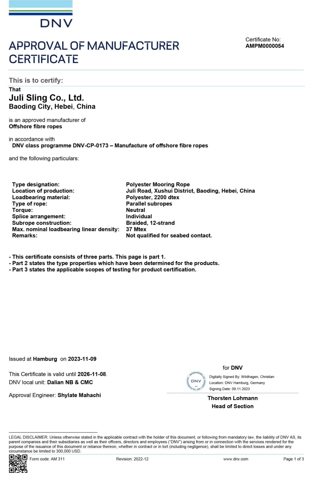 (DNV長期系泊纜繩(滌綸)工廠認(rèn)可證書)