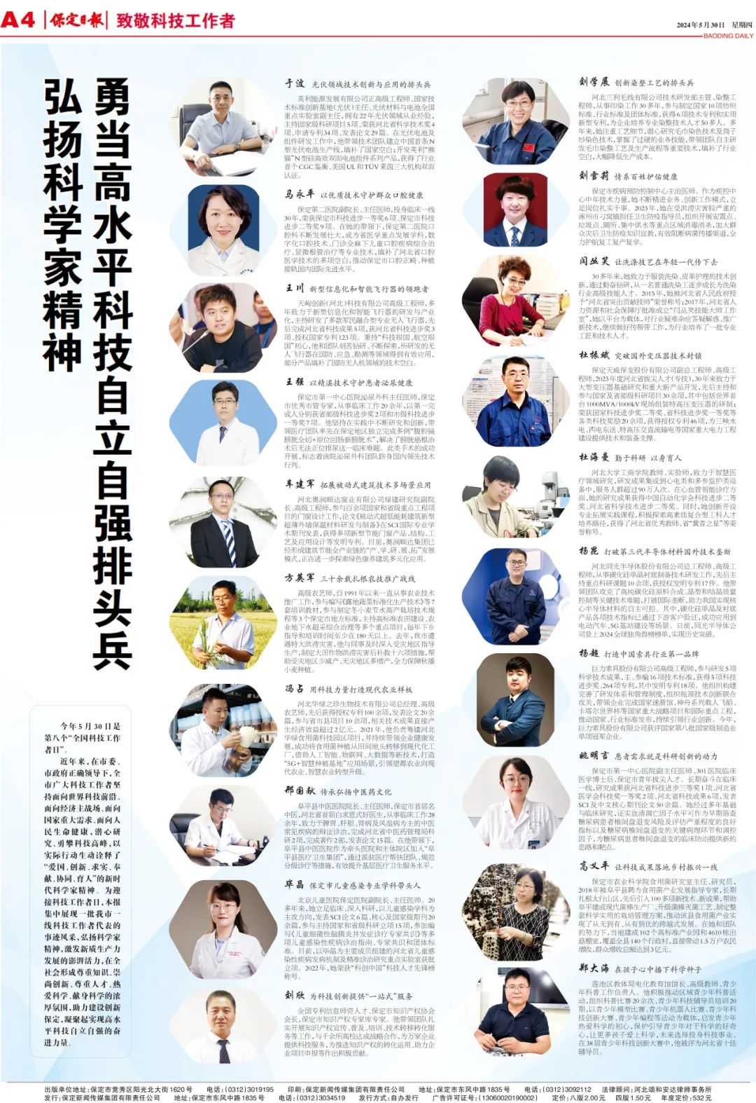 近日,保定市市委宣傳部、市科學(xué)技術(shù)協(xié)會、市科技局聯(lián)合開展了2024年保定市“全國科技工作者日”評選活動,經(jīng)組織推薦和評審專家委員會綜合評比、公示,巨力索具股份有限公司黨總支書記、總裁楊超榮獲“最美科技工作者”稱號。