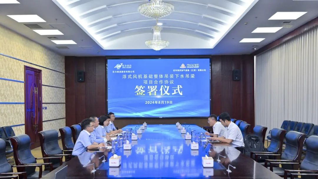 8月19日,巨力索具與宏華海洋油氣裝備(江蘇)有限公司(以下簡稱宏華海洋)就“浮式風(fēng)機(jī)基礎(chǔ)整體吊裝下水吊梁”簽署項目合作協(xié)議。巨力索具常務(wù)副總裁李彥英、宏華海洋副總經(jīng)理呂巖分別代表雙方簽署協(xié)議。巨力索具副總裁張海波、宏華海洋技術(shù)副部長李博參加會議。