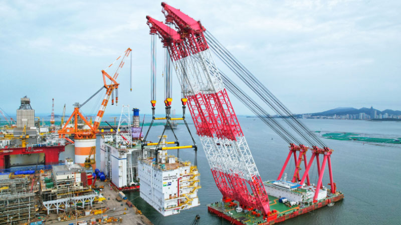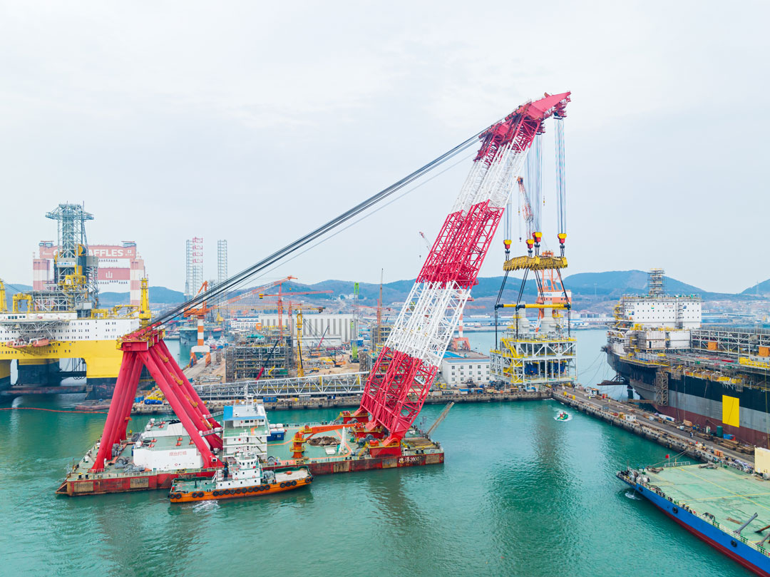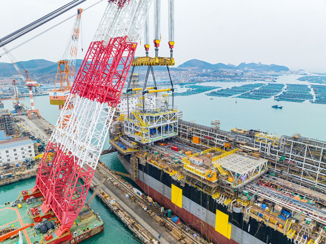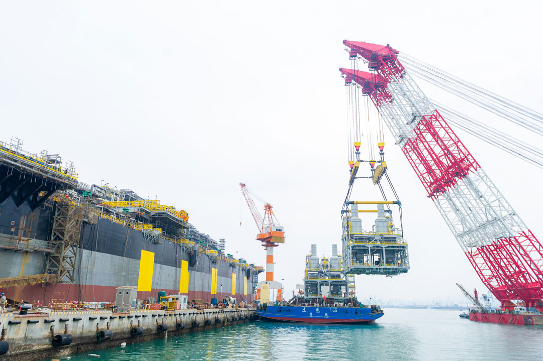 近日,中集來福士浮式生產(chǎn)儲(chǔ)油船(FPSO)重為3669噸的S20、2960噸的P60、2766噸的P20三大模塊吊裝完成。巨力索具為其提供了承載量為3000噸、2500噸的平衡梁梁式吊具、卸扣、無接頭繩索等產(chǎn)品,并為保證吊裝的順利進(jìn)行制訂了嚴(yán)謹(jǐn)?shù)牡跹b方案。