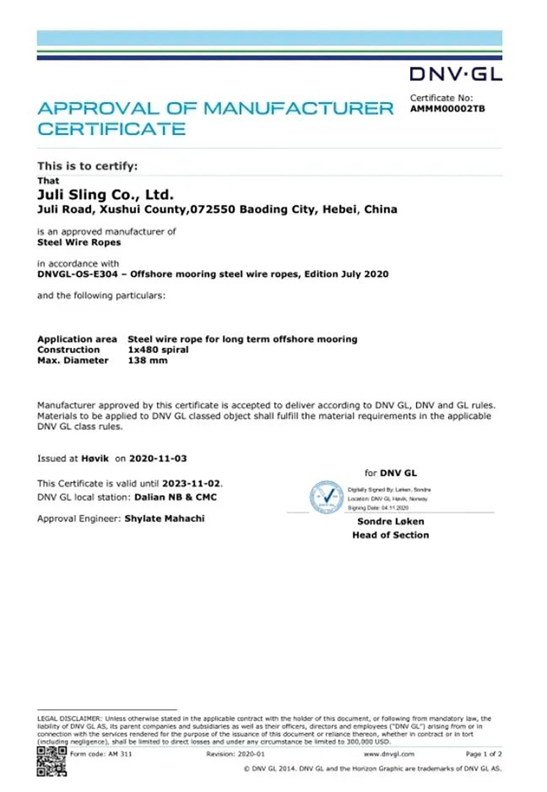 2020年11月,巨力索具取得了永久系泊用單股涂塑鋼絲繩的DNV·GL工廠認(rèn)可證書(shū),成為國(guó)內(nèi)首家通過(guò)該類(lèi)鋼絲繩DNV·GL工廠認(rèn)可的廠家。